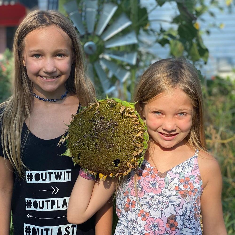 Figured we would teach the girls some homesteading. I’ve been growing Mongolian mammoth sunflowers from a dozen seeds I got a few years back and we reserve some back to replant every year. This year we have an abundance so we will be selling some with profits going to next years garden. They grow around 14 feet high, and we will be doing a generous seed bag of 50-75 seeds for $12. Louise and I work hard in the garden and so a Lou for scale of sunflower heads.